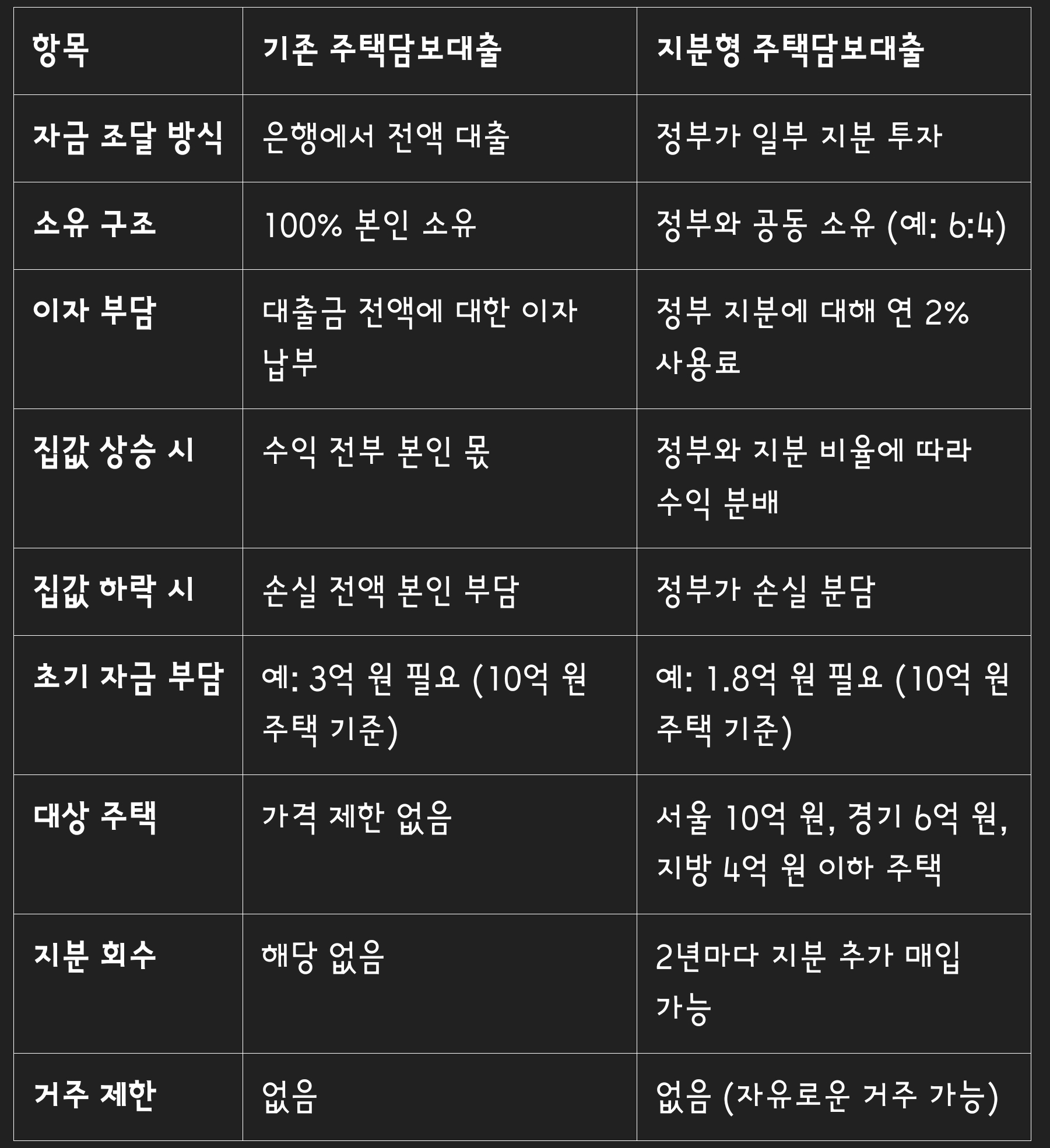 기존 주택담보대출 vs. 지분형 주택담보대출 비교표